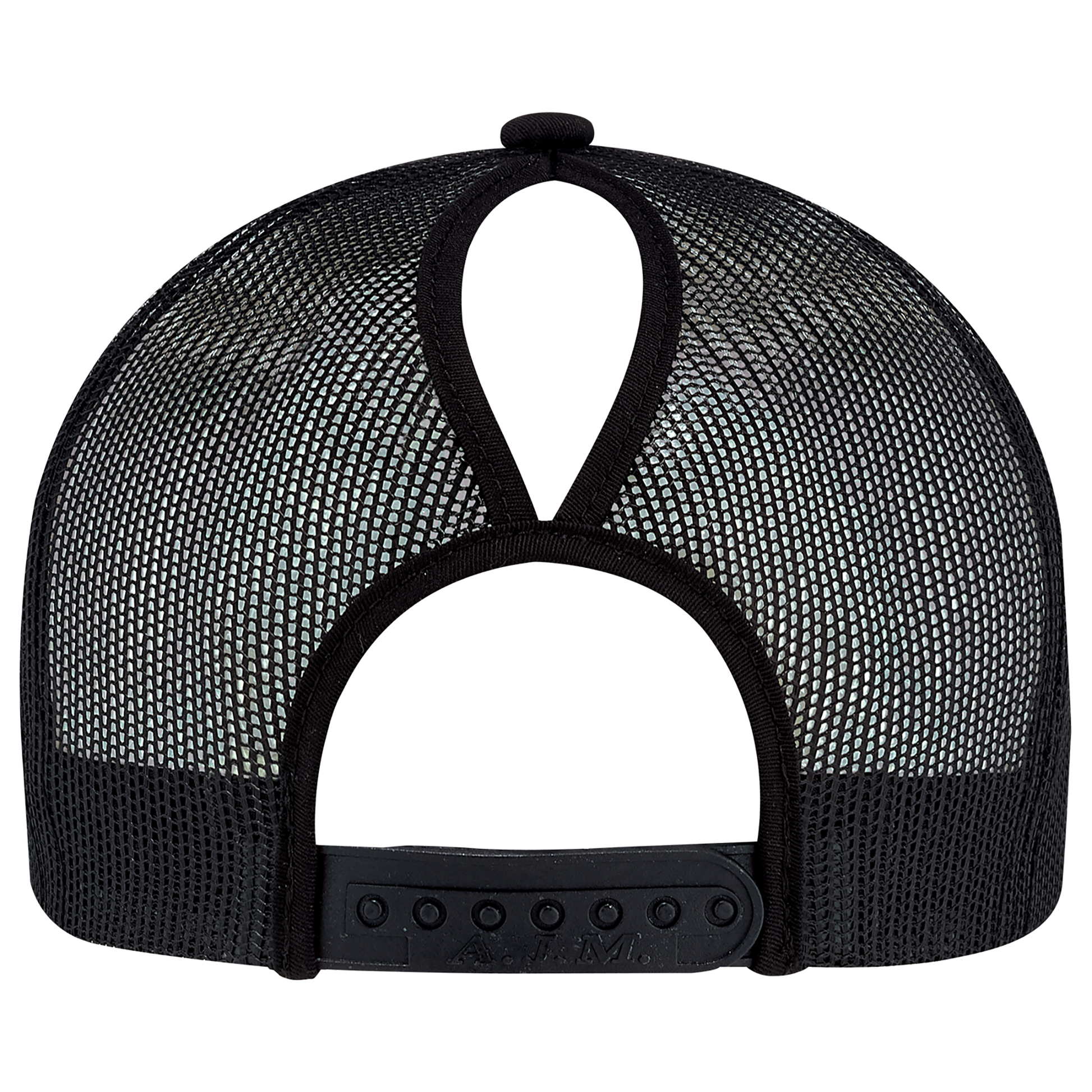 Le devant de celle-ci est en tissu mélange de poly/coton couleur noire et l’arrière est en filet noir avec ouverture pour queue-de-cheval entre les 2 sections arrières .